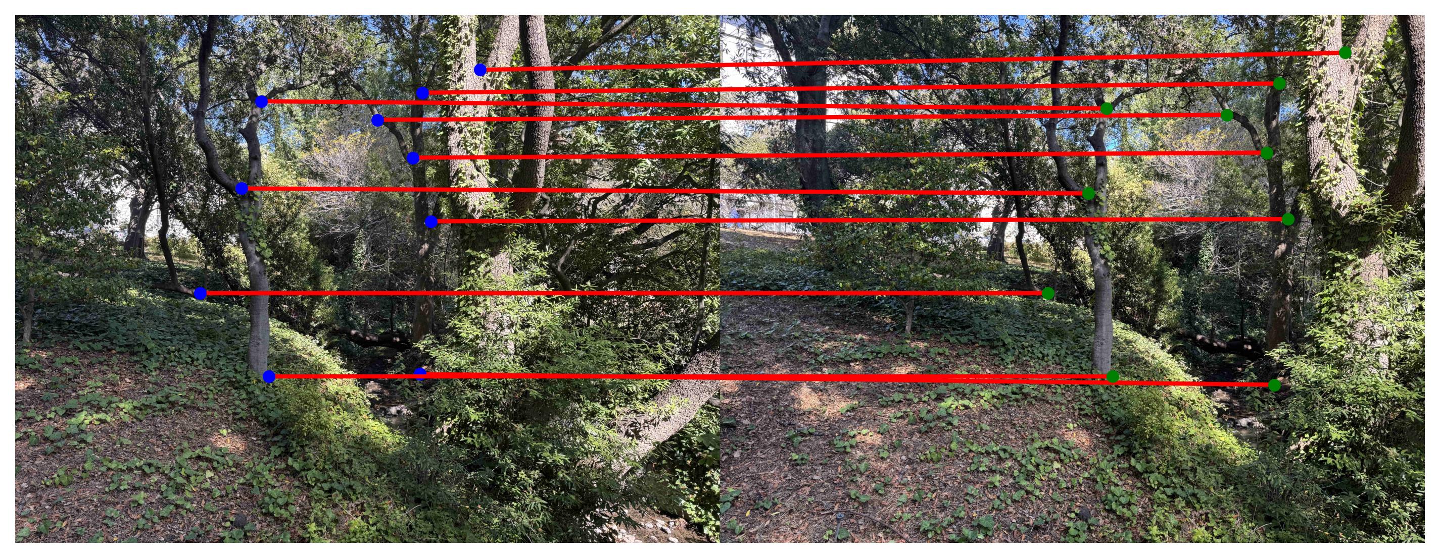 Now being able to extract the feature descriptors in the images, for the left and right images, we will find the pairs that look most similar (feature similarlity was computed using Euclidean distance) to the center image. The matches were then filtered with Lowe’s ratio test. The Feature Matching method I implemented produced these results: