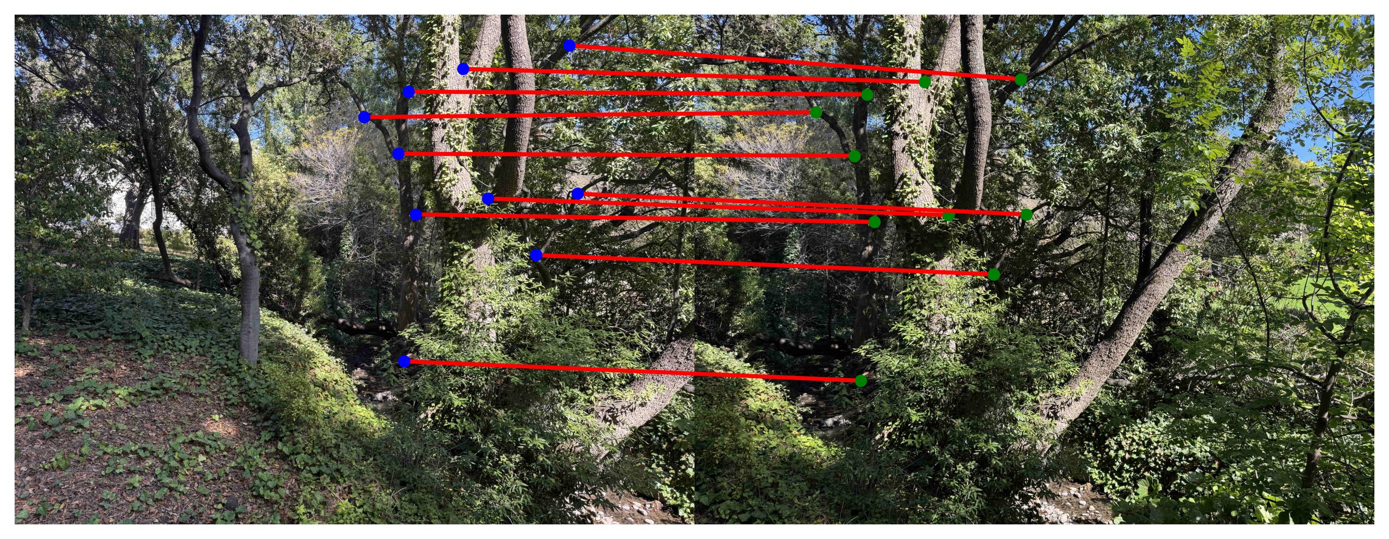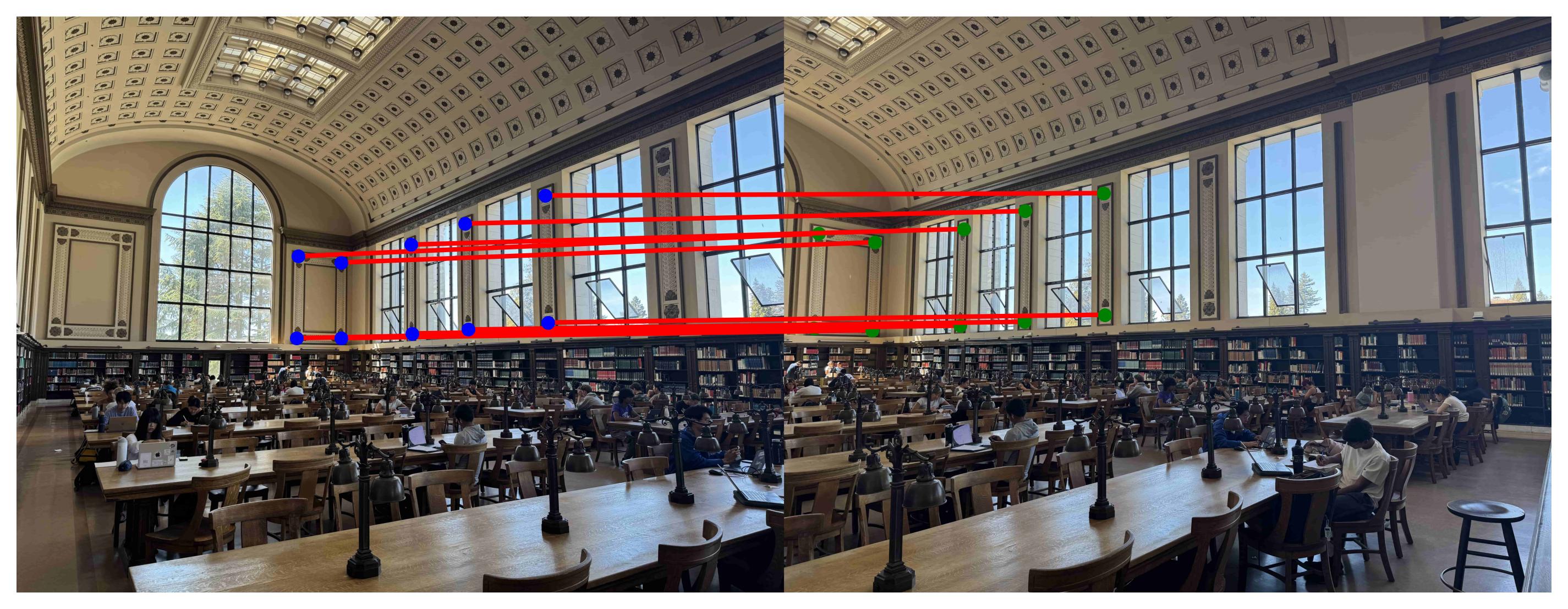Using numpy.linalg.lstsq, I will frame the homography transformation \(p' = Hp\) as a Least Squares problem \(Ah = b\) to solve for \(h\), the flatten version of the homography matrix \(H\). This will allow to recover the parameters of the projection between pairs of images to warp them into alignment.