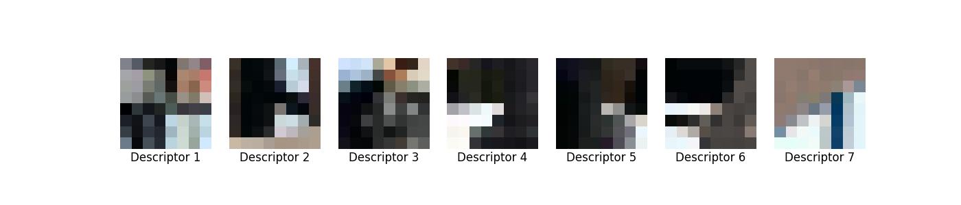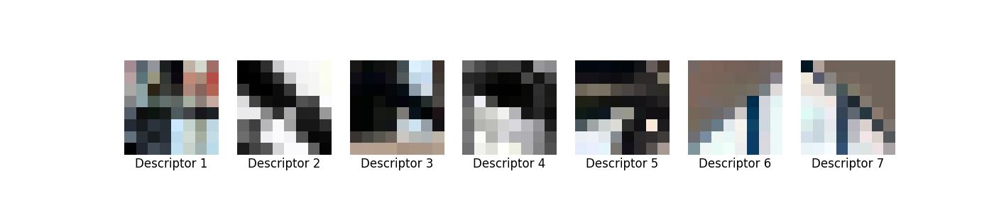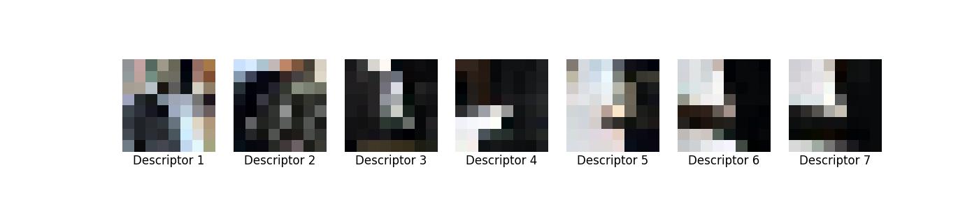 Using the suppressed Harris corner points, I implemented Feature Descriptor extraction method to extract \(8 \times 8\) feature descriptors. Here are 7 extracted features on the Doe Library image set: