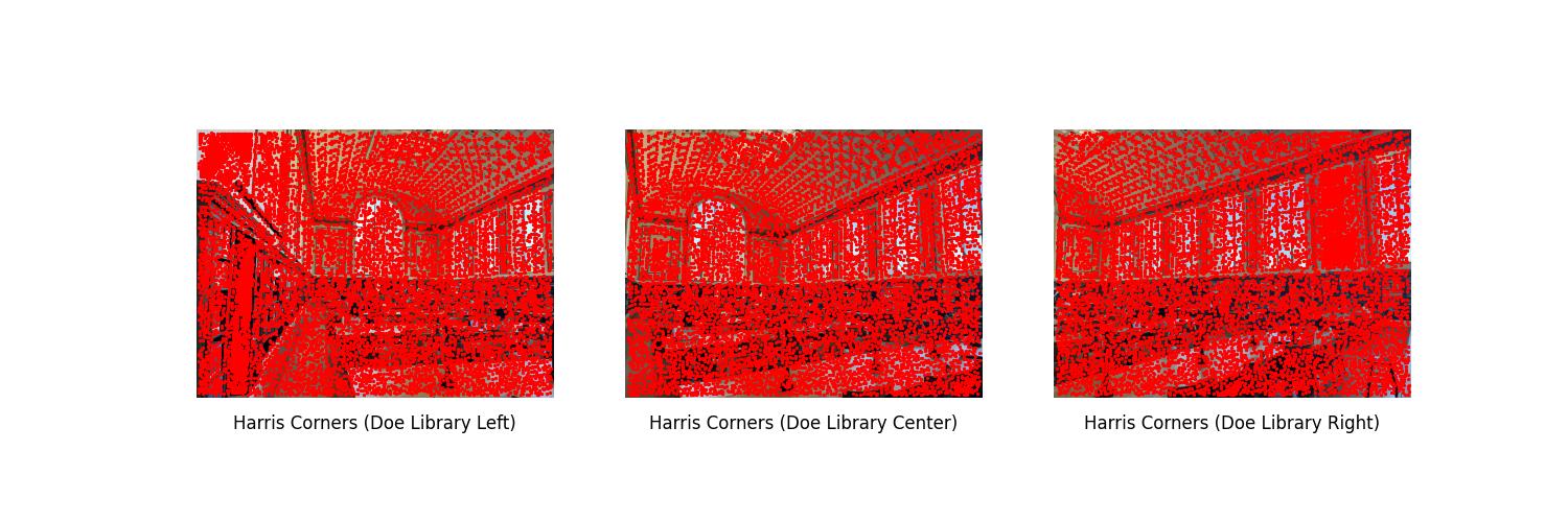 Using the provided starter for the Harris Interest Point Detector, these are the Harris corners found on the Doe Library image set: