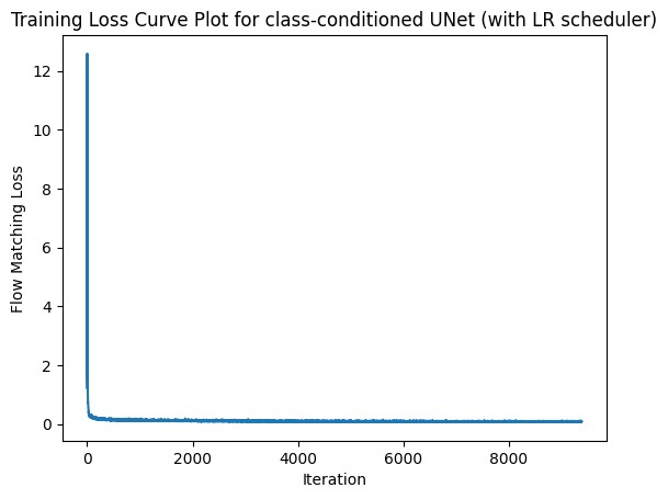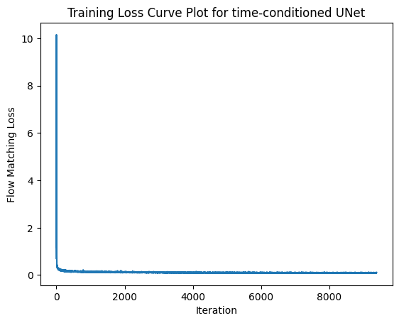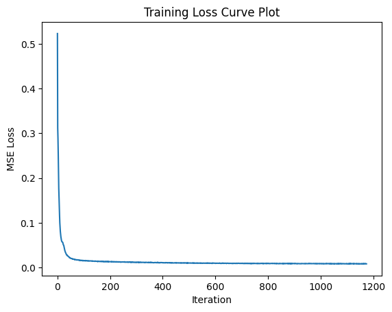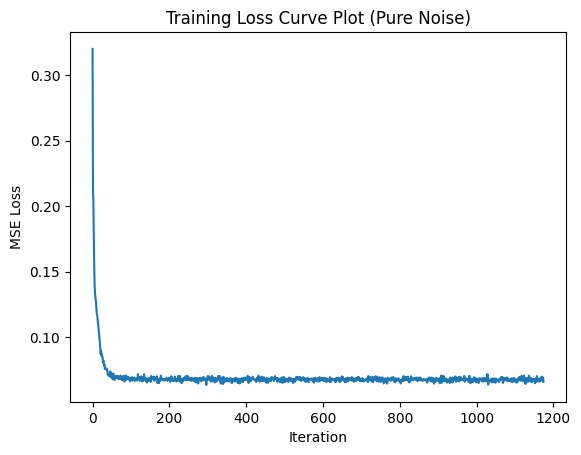 To make denoising a generative task, ideally we would like to be able to denoise pure, random Gaussian noise (\(z = \epsilon\)) into a clean digit. Now, I trained a separate unconditional UNet to denoise pure noise by inputting pure noise and computing the loss against the MNIST training set. This was the training loss curve plot during the whole training process of \(\sigma = 0.5\):